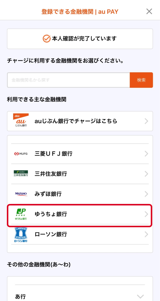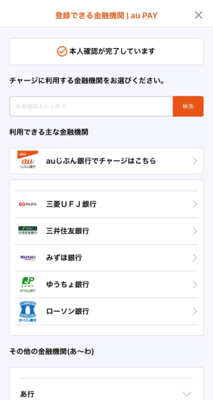 au PAY アプリのHOMEにあるチャージを押下し、チャージメニューから「銀行口座」を選択いただき、ご登録頂く金融機関 を選択ください。