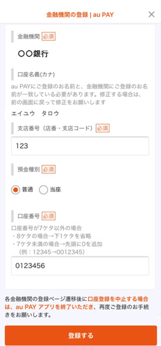 登録したい金融機関を選択し、銀行口座の情報を登録します。