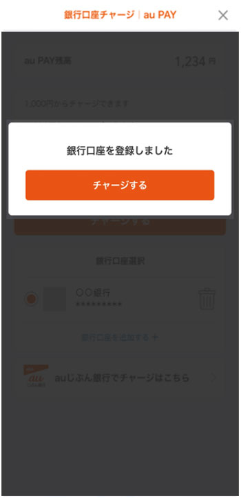 au PAY アプリのHOMEにあるチャージを押下し、チャージメニューから「銀行口座」を選択いただき、ご登録頂く銀行を選択ください。